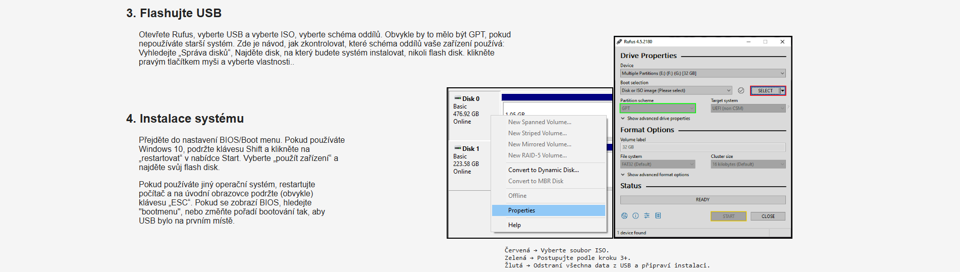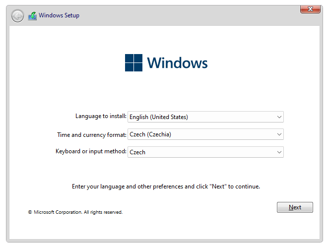 Už jdeme do finále! Stačí vybrat jazyk a layout klávesnice, přijmout smluvní podmínky a vybrat "custom" na této obrazovce.