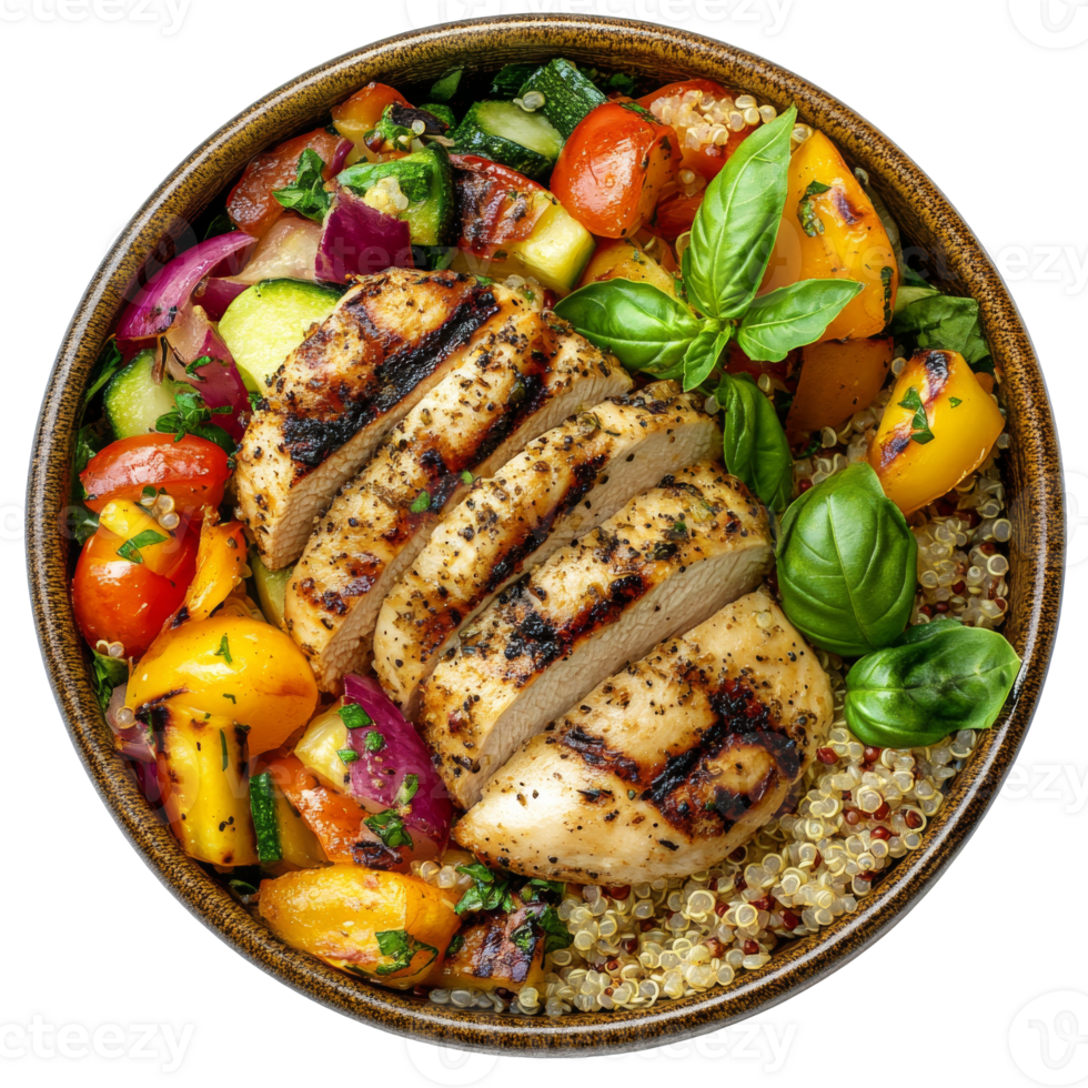 330g | kuřecí prsa, quinoa, paprika, okurka, mrkev, jogurtový dip
